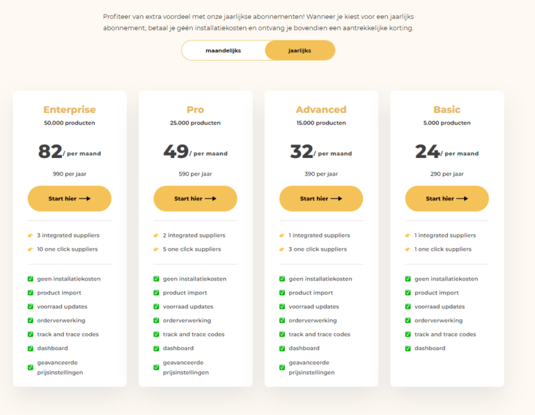 - Product import, voorraad updates, orderverwerking, track & trace codes, dashboard en geavanceerde prijsinstellingen