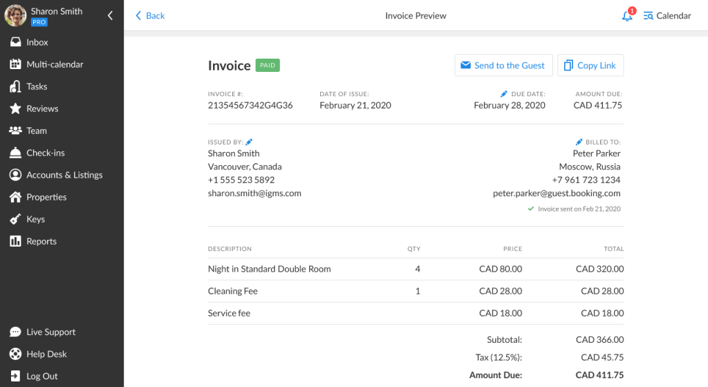 Efficient invoice management is crucial for maintaining financial records and ensuring accurate accounting. iGMS’ Integrated Invoicing feature enables you to generate and manage invoices seamlessly within the platform. You can customize invoice templates, include specific reservation details, and track the status of invoices. By centralizing your invoicing process, you can save time and easily access financial data when needed.