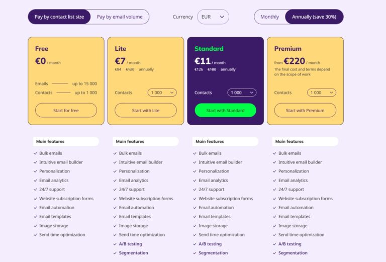 Selzy's versatile pricing structure is tailored to accommodate a range of business requirements. Whether you prefer payment based on your contact list size, email volume, or opt for the Pay As You Go model, Selzy provides transparent and competitive pricing options.